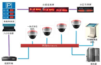 系統主要包含智能停車誘導、智能視頻尋車和視頻監控等功能。整體系統以智能停車場管理系統iVMS-8640平臺為依托,管控整個停車場的業務功能。其中智能停車誘導主要通過LED電子顯示屏和車位像機指示燈的方式指引車主停車。智能視頻尋車通過在終端觸摸查詢機上輸入車牌號碼的方式定位車輛所停車位。車位相機全覆蓋停車場所有停車位,兼顧了車位監控的功能,業主無需另外配置監控像機,節省用戶成本。