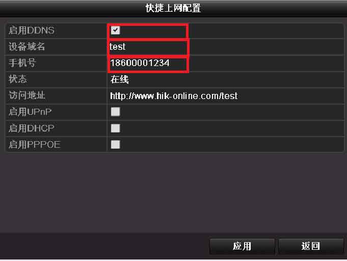 勾選啟用DDNS,設(shè)置設(shè)備域名(自定義,只支持小寫字母、數(shù)字以及“—”且必須以小寫字母開頭,必填),手機號碼(后續(xù)增值服務(wù)使用,必填)。當(dāng)設(shè)備狀態(tài)顯示在線時可以使用自動生成的訪問地址來訪問設(shè)備。